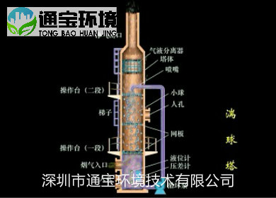 酸霧洗滌塔利用氣體與液體間的接觸,而將氣體中的污染物傳送到液體中,然后再將清潔氣體與被污染的液體分離,達到清凈空氣的目的。廢氣經由填充式酸霧洗滌塔,采用氣液逆向吸收方式處理,即液體自塔頂向下以霧狀(或小液滴)噴撒而下。廢氣則由塔體(逆向流)達到氣液接觸之目的。此處理方可冷卻廢氣、調理氣體及去除顆粒,再經過除霧段處理后,排入大氣中。